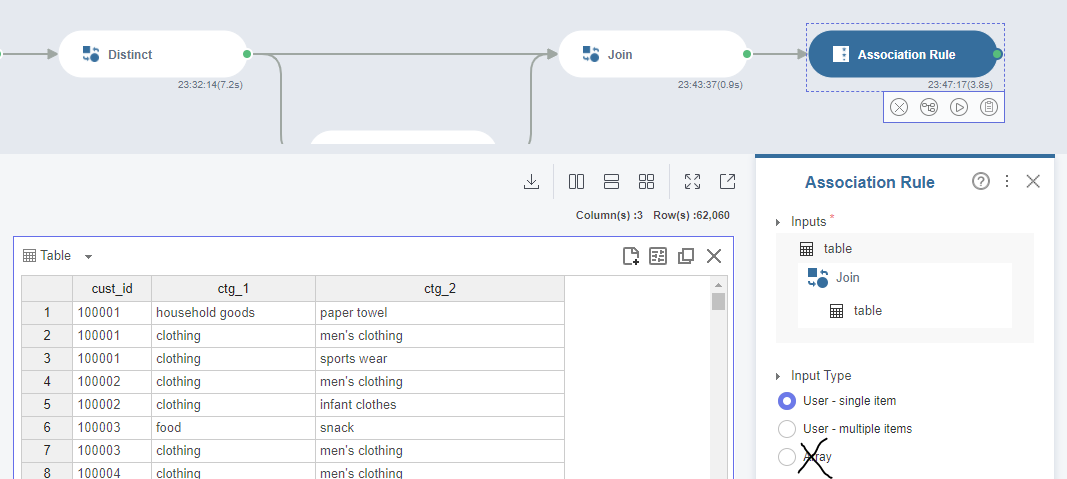 인풋 타입에서 user - single item 은 아래 캡쳐 처럼 하나의 컬럼 안에 하나의 데이터가 들어가 있는 경우에 사용하면 됩니다. 만약 하나의 컬럼 안에 여러 개의 데이터가 예를 들어 clothing;sports wear;food 이런 식으로 들어가있는 경우라면 user - multiple items 를 사용해주어야 합니다.