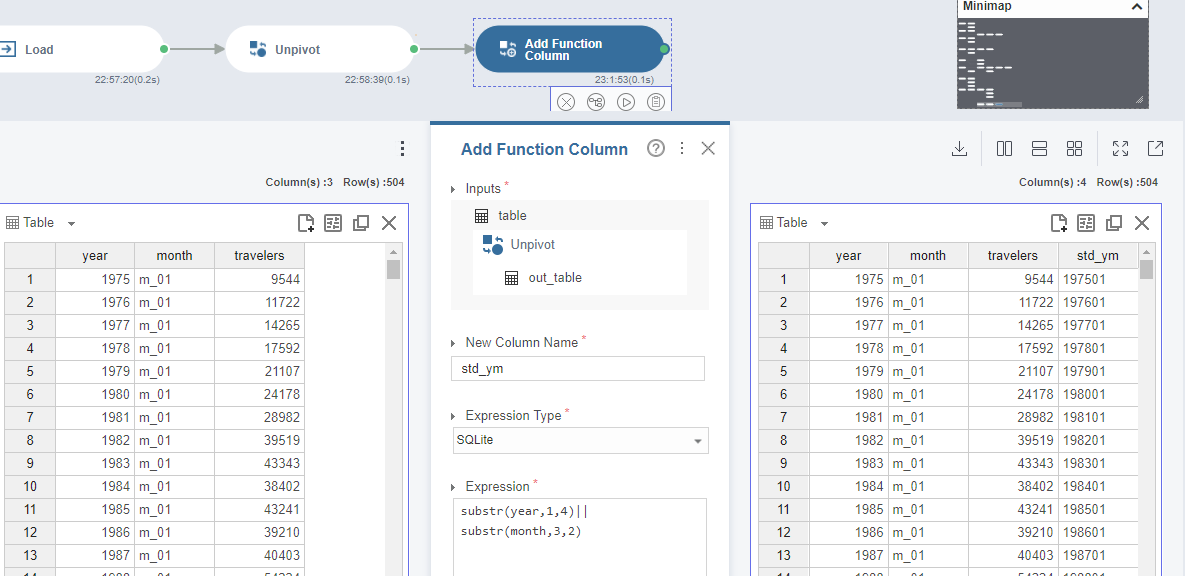 Weights 는 가중평균 관련 설정입니다. uniform weights를 선택하면 동일하게 가중치를 주고, custom weights를 선택하면 직접 가중치를 설정할 수 있습니다. window size의 경우 주변의 몇 칸 까지 계산에 넣을 지를 설정하는 부분입니다. mode 설정은 두 가지 인데, past values only를 자주 쓰게 될 겁니다. 이것은 과거 값들로만 이동평균값을 구하겠다는 뜻인데요, centered moving average를 만약에 선택하고 window size는 아래 그림처럼 3을 해두면 앞뒤로 3칸을 이동평균값을 구하는데 사용하겠다는 뜻이 됩니다. 아래 그림에서는 과거 값 3개만 계산에 포함되도록 설정했기 때문에 travelers_ma 컬럼에서 맨 앞의 2 개 칸은 계산할 3개 칸이 없기 때문에 null로 보이게 됩니다.