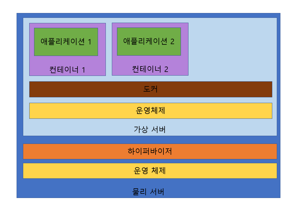 가상서버 환경에서는, 물리서버 하나 안에 운영 체제를 깔고 그 위에 하이퍼바이저 환경을 만들고, 그 위에 여러 개의 가상 서버가 돌아가게 됩니다. 각 서버 마다 다시 운영체제와 애플리케이션이 각각 들어가있는 구조입니다.