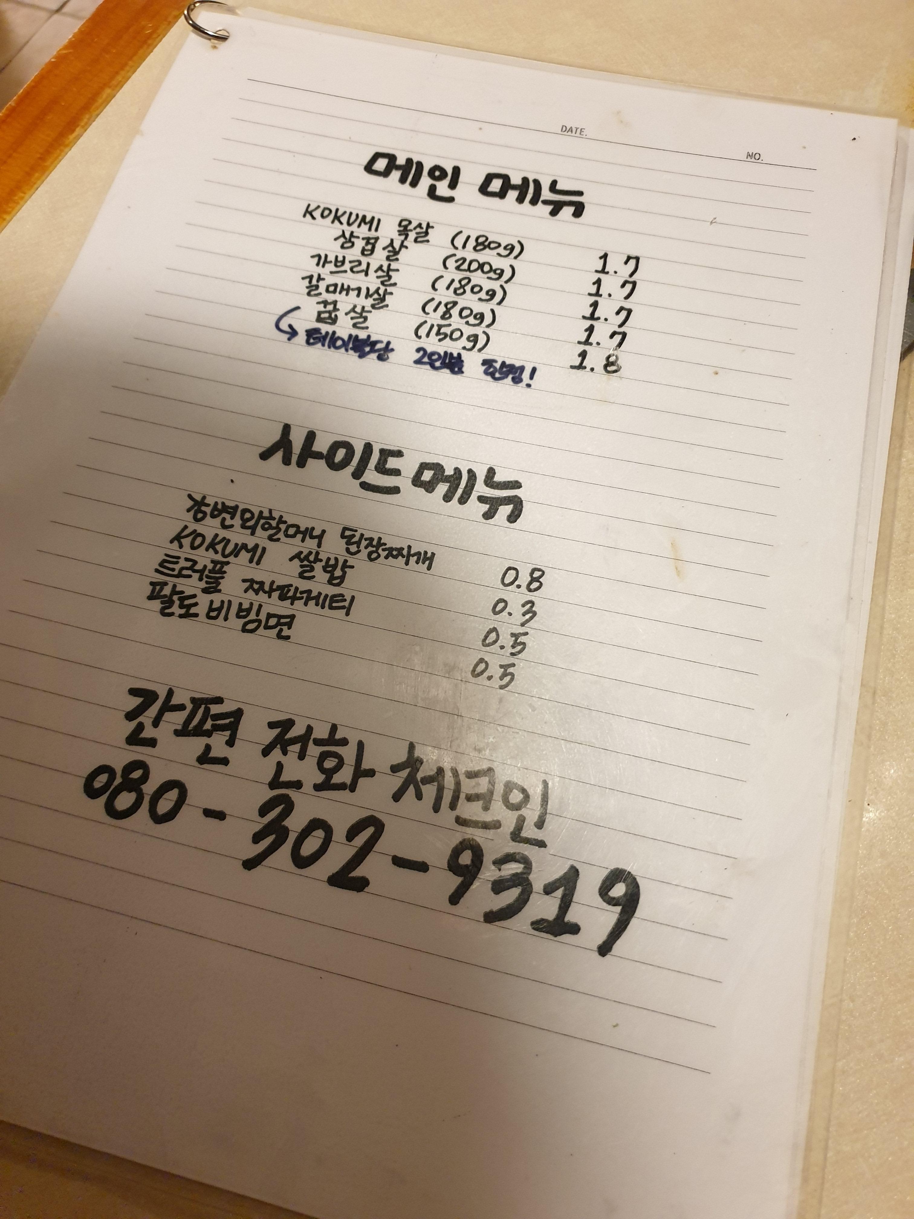 요건 메뉴판이에요. 가장 유명한 메뉴는 꼬꾸미 목살이라고 알려 주셔서 그걸로 시켜보았어요.