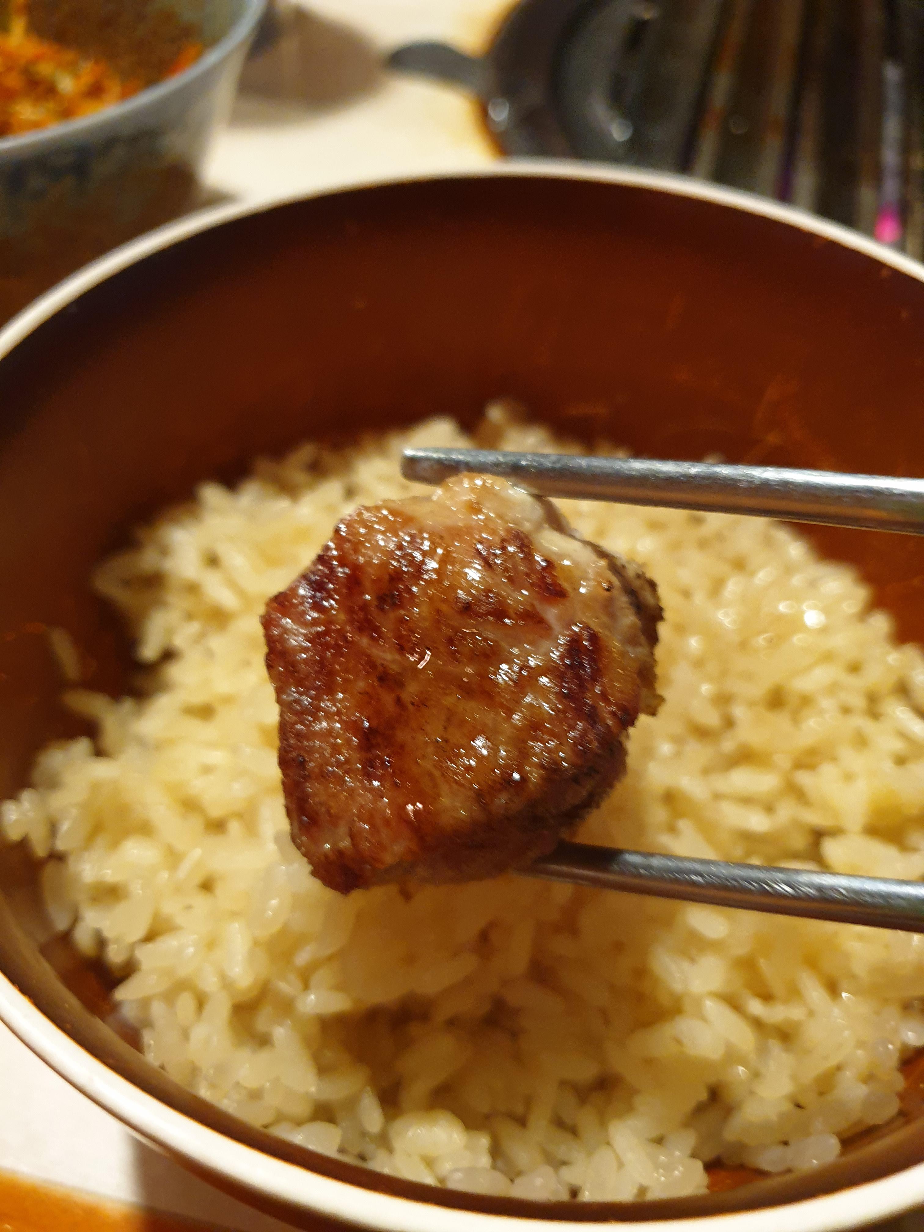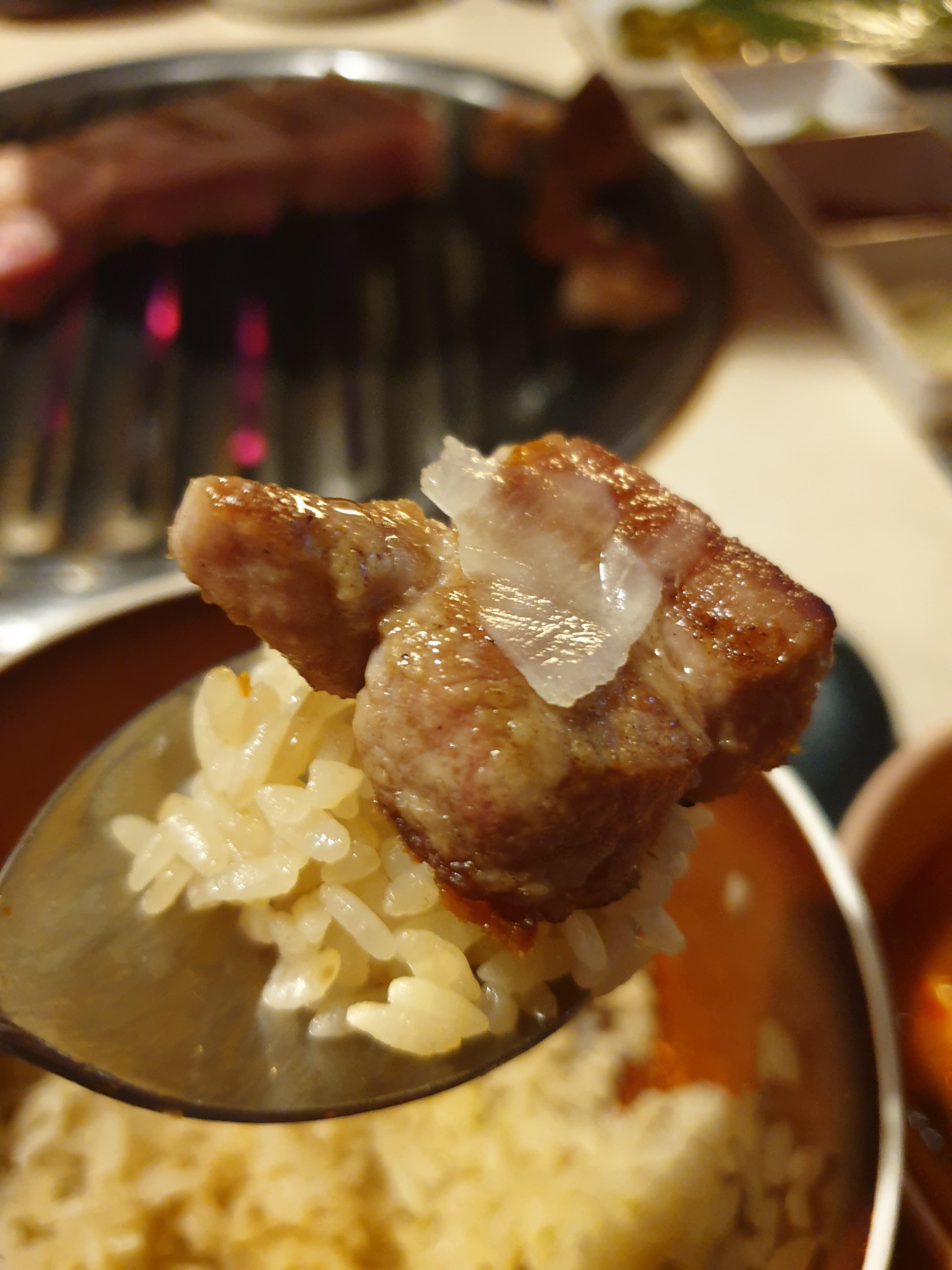 드디어 고기를 먹어봅니다! 사장님이 쌀밥 위에 고기를 얹어서 같이 먹어보라고 추천해주셔서 따라해보았어요. 이건 목살이에요.
