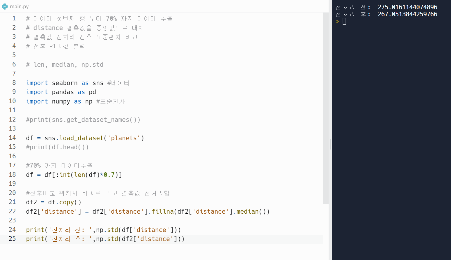 # 결측값 전처리 전후 표준편차 비교