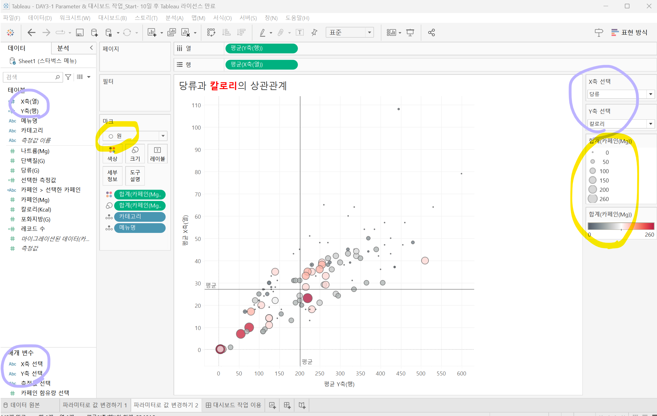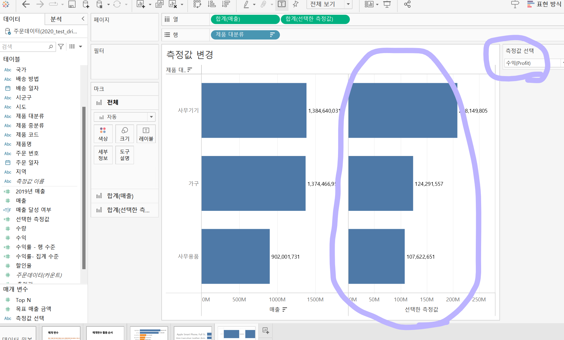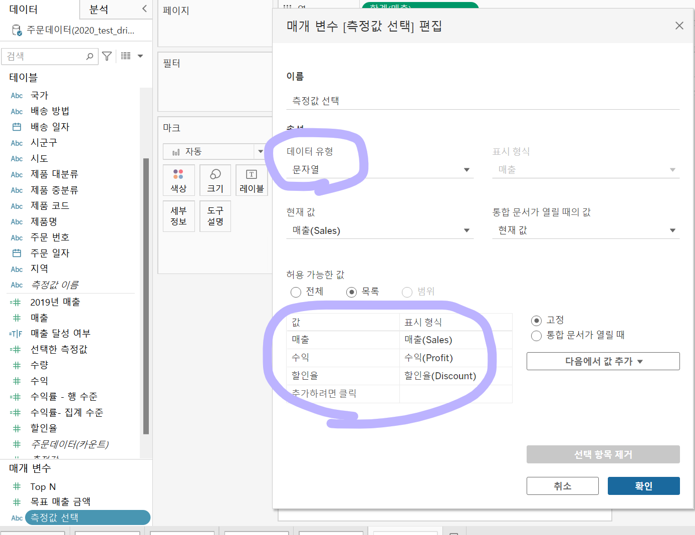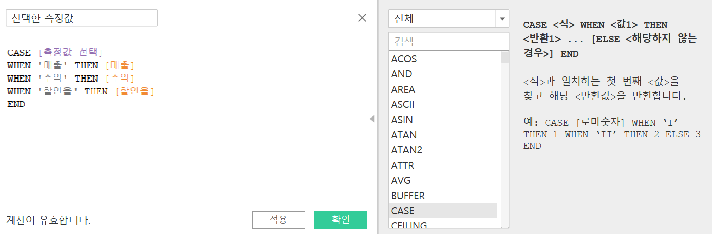 2. 계산된 필드 - 매개 변수에 선택된 값을, 데이터랑 매칭 시켜줌. IF문 이나 CASE 문 사용.